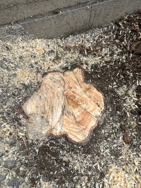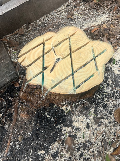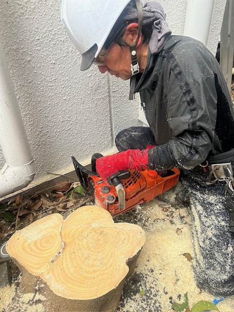 また、伐採後に再びタブの木が芽吹かないよう、幹に切り込みを入れて薬剤を注入し処理。近隣に影響が出ないよう配慮しながらの作業となりました。